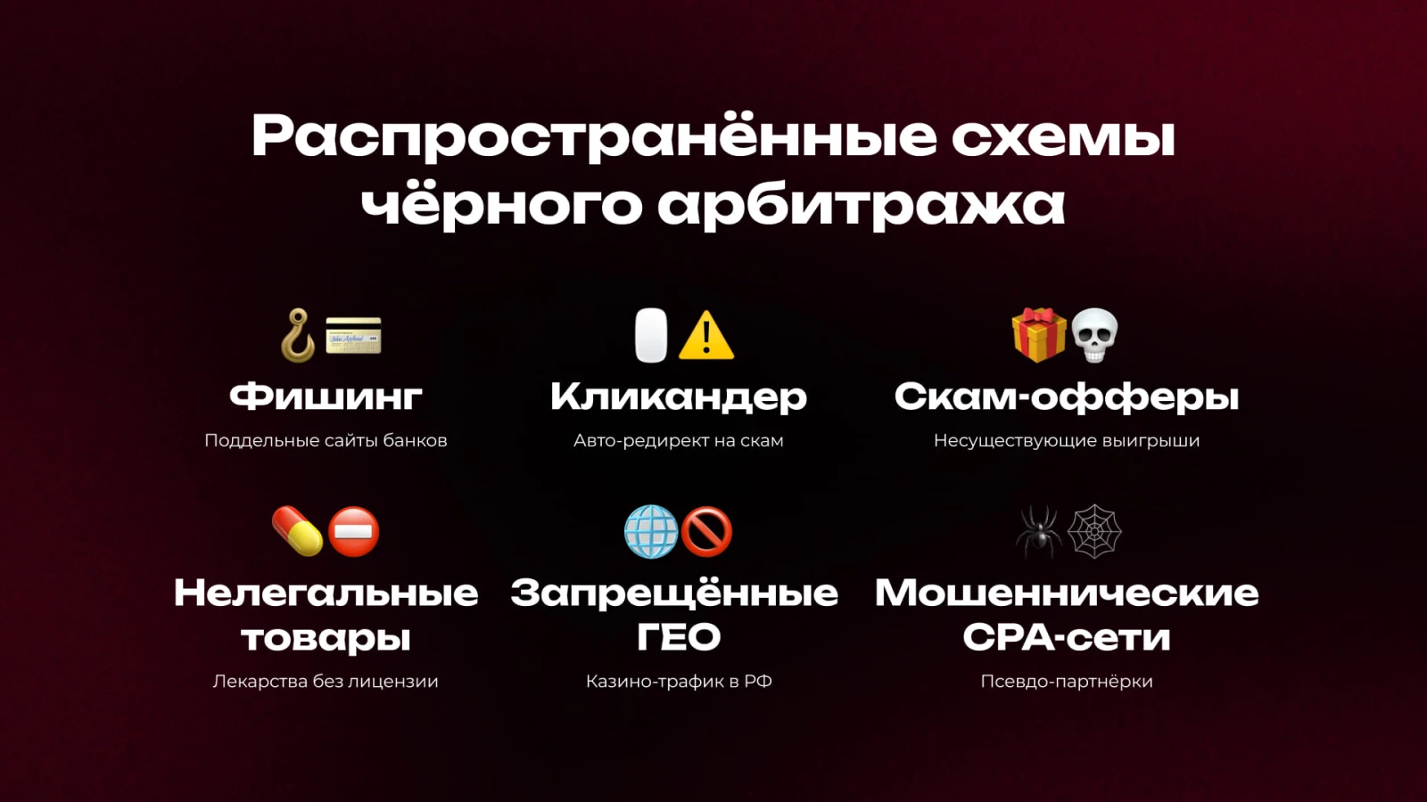Черный арбитраж — это продвижение офферов, которые намеренно нарушают закон или правила рекламных платформ. Это не «серые» методы вроде клоакинга или мислида — это прямое нарушение: фишинг, мошенничество, продажа запрещенных товаров, создание фейковых инвестиционных проектов.