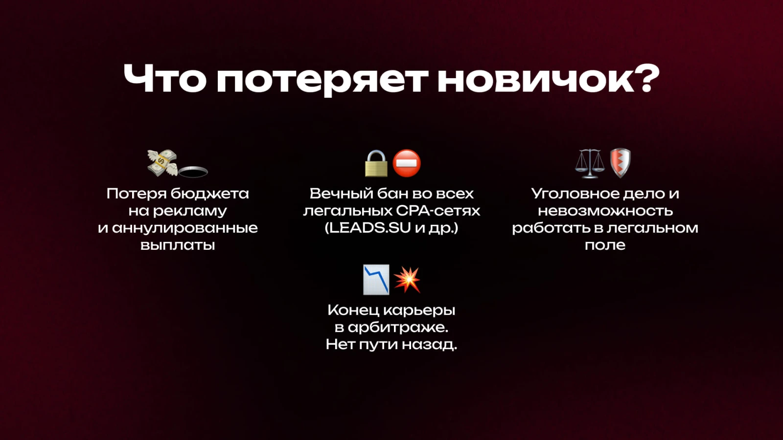 Черный арбитраж — это не просто нарушение правил, а угроза самому существованию партнерской программы. Именно поэтому все легальные CPA-сети (включая LEADS.SU) категорически запрещают такие схемы.
