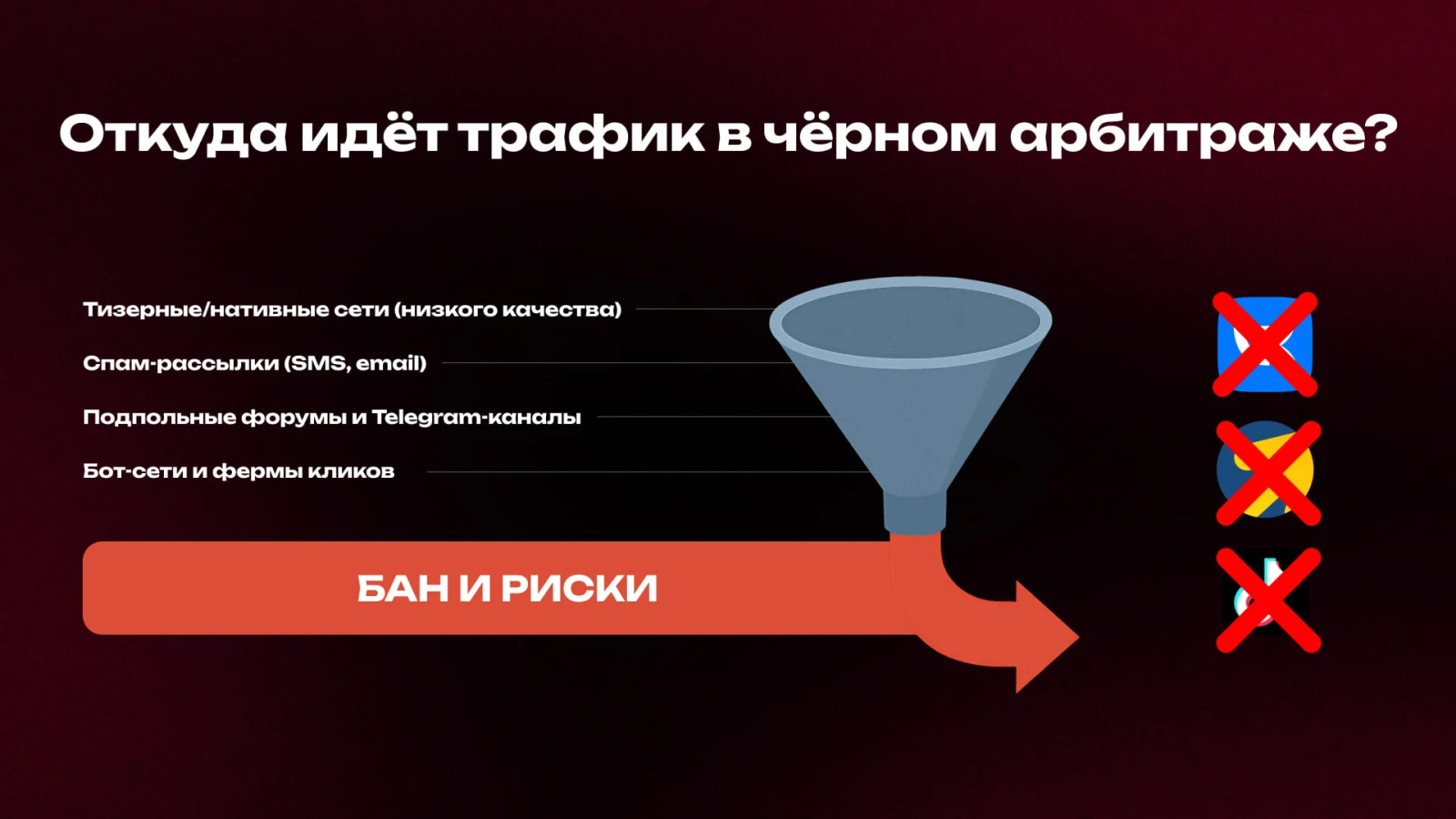 Черный арбитраж не может использовать легальные каналы — такие офферы моментально блокируются в Яндексе, ВКонтакте, Telegram и других крупных платформах. Поэтому используются только теневые источники:
