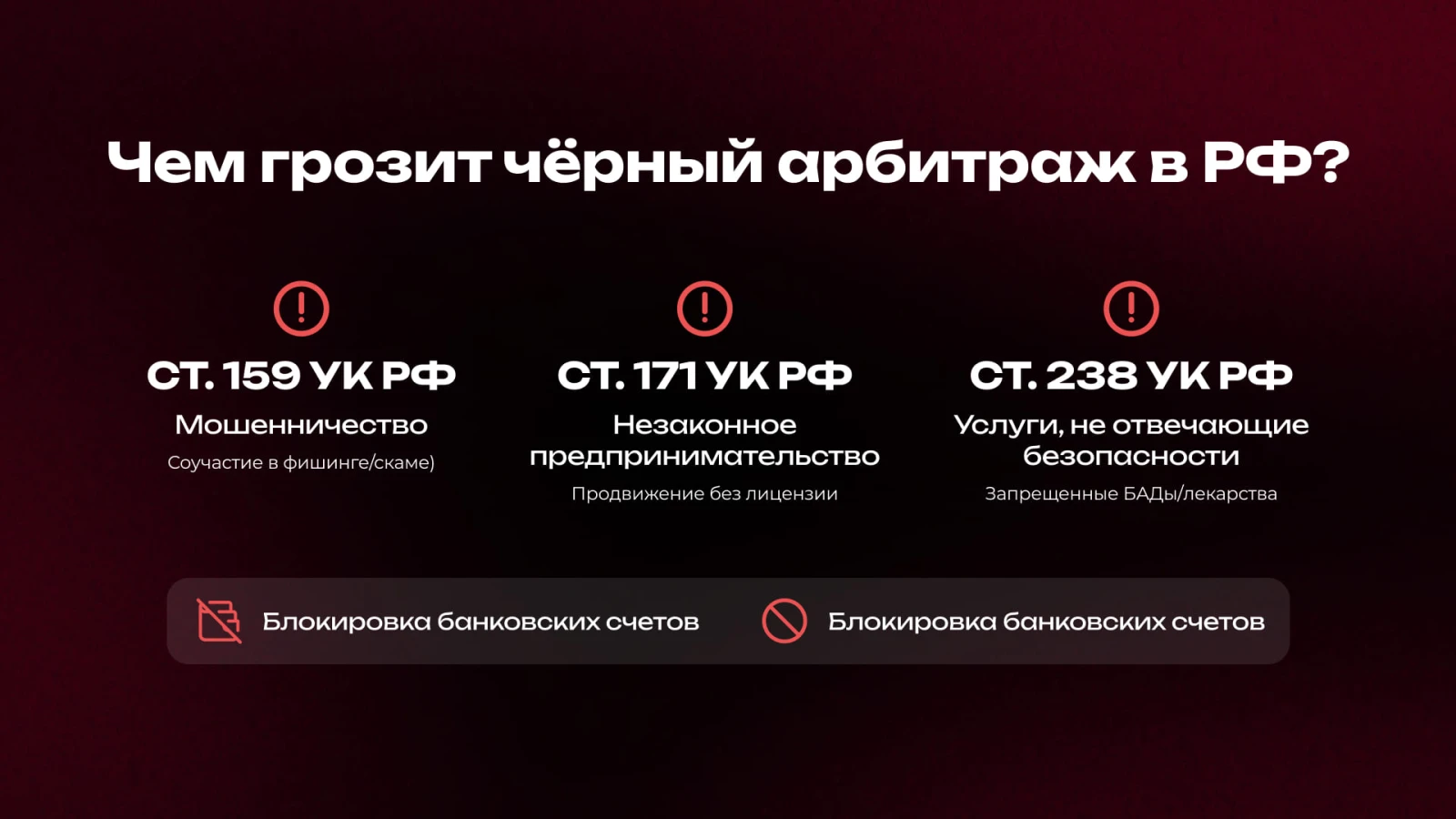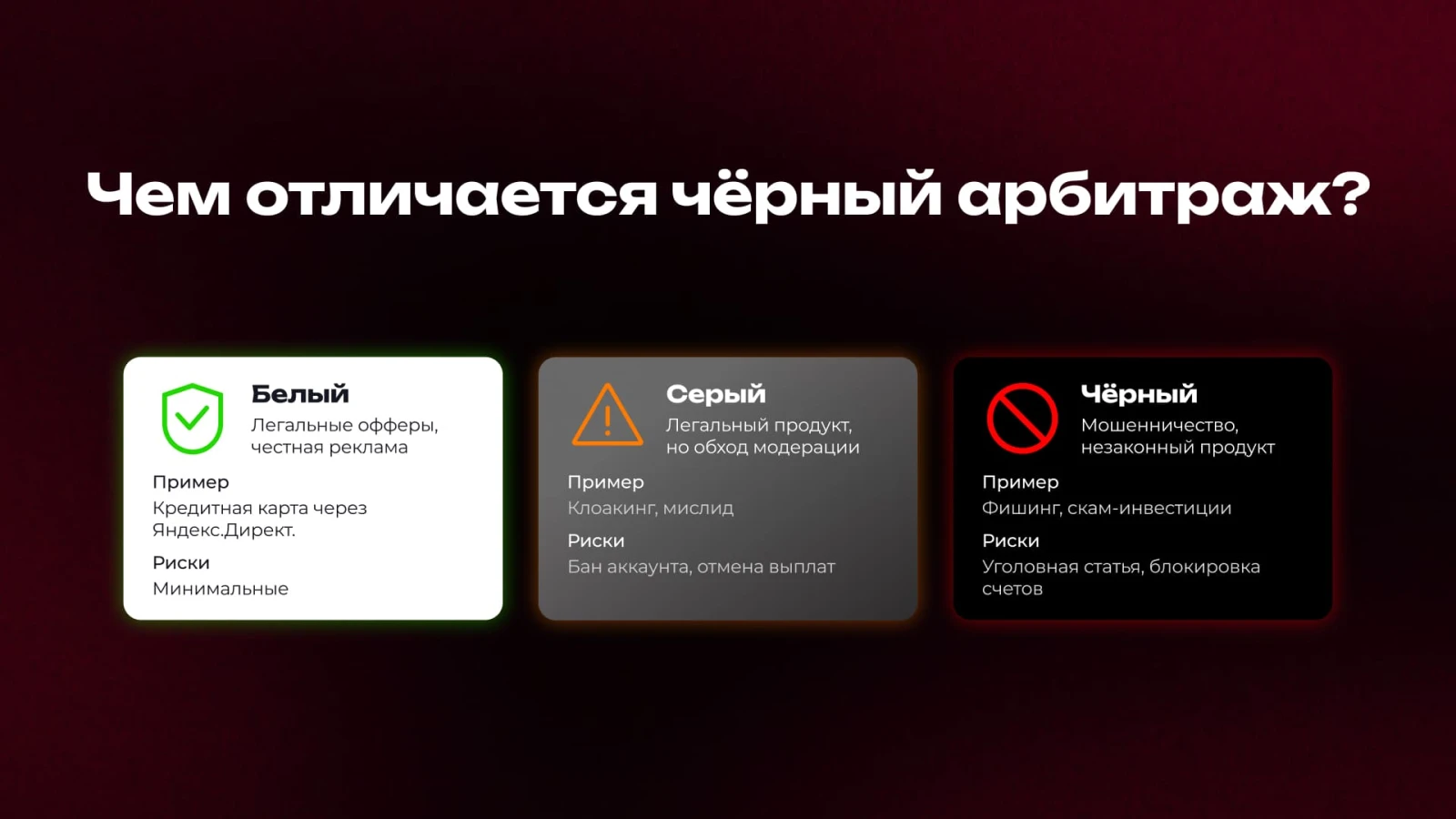 | Черный арбитраж | Незаконный продукт или мошенничество | Фишинг-сайт «Сбербанк-онлайн», скам «инвестиционный фонд» с обещанием 500% дохода | Катастрофические. Уголовка, блокировка счетов, запрет на будущую работу. |
