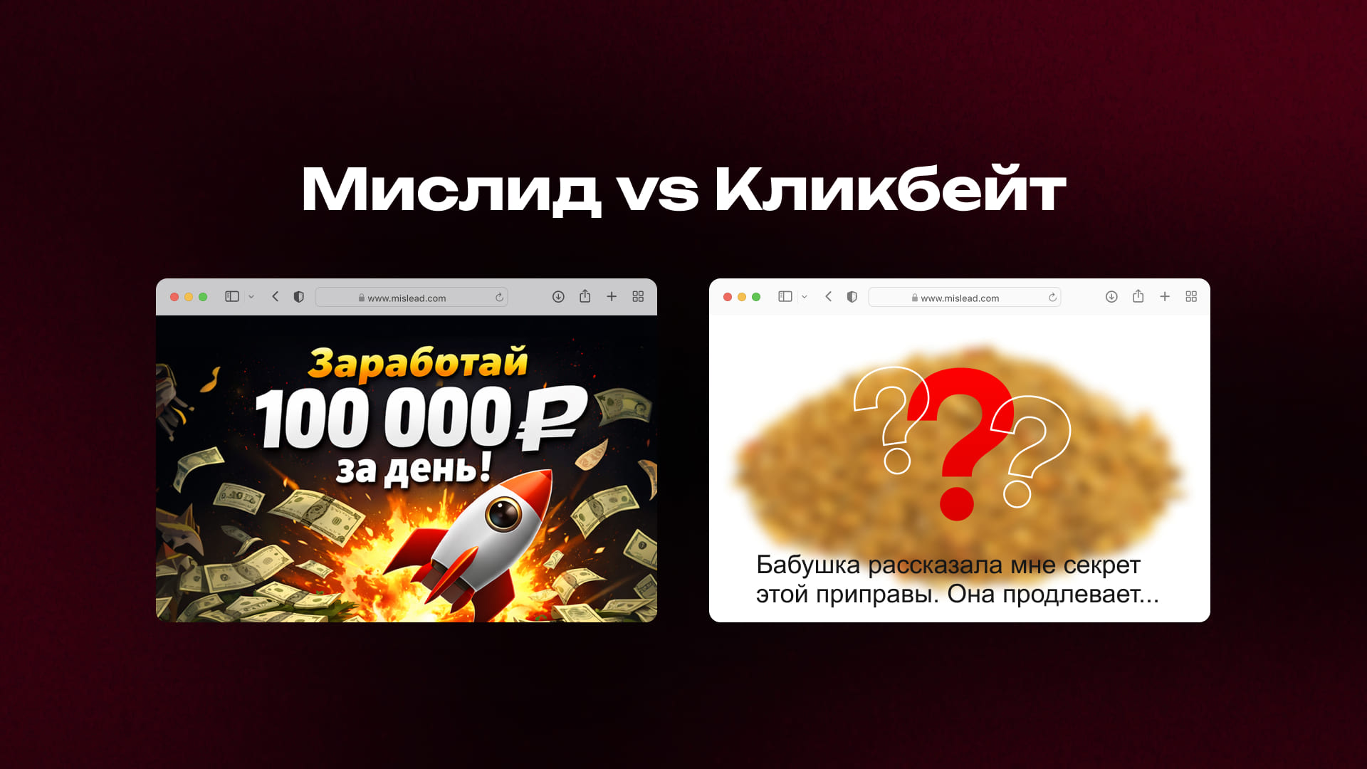 - Мислид — это прямая ложь. После клика вы получаете не то, что обещано. Кликбейт раздражает, а мислид — это фрод, за который банят навсегда.