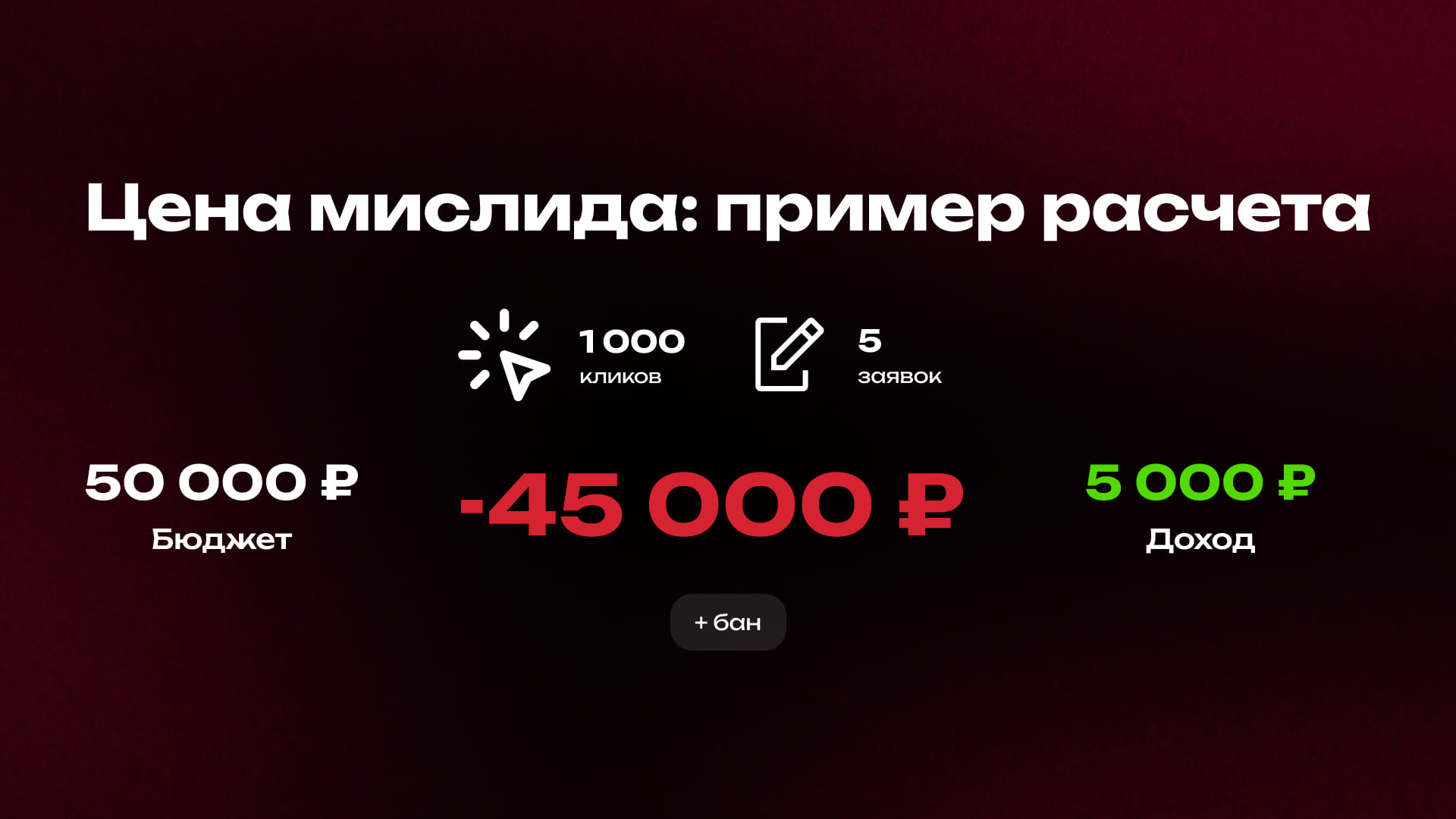 ⬇️ Расчёт убытков: Допустим, вы потратили 50 000 ₽ на мислид-трафик. Вы получили 1000 кликов (CPC 50 ₽). Из-за плохого качества конверсия в заявку составила 0.5% (5 заявок). При выплате 1000 ₽ за лид ваш доход — 5000 ₽. Убыток — 45 000 ₽, плюс заблокированный аккаунт.