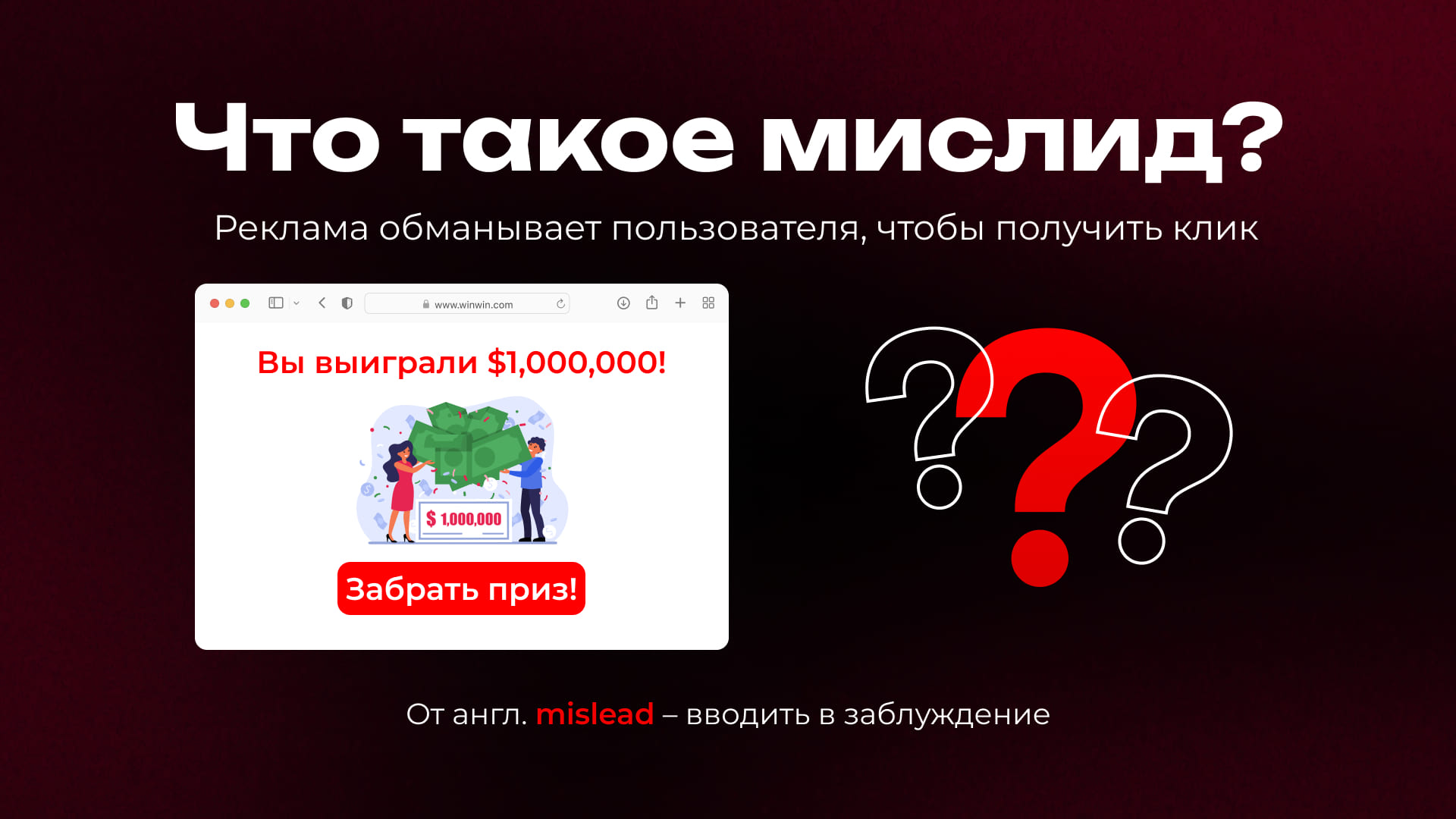 Мислид (от англ. mislead — «вводить в заблуждение») — это обман в рекламе. Представьте: вы видите баннер «Срочно! Ваш компьютер заражён!» — кликаете, а вас ведут не на антивирус, а на сайт казино. Вот это и есть мислид.