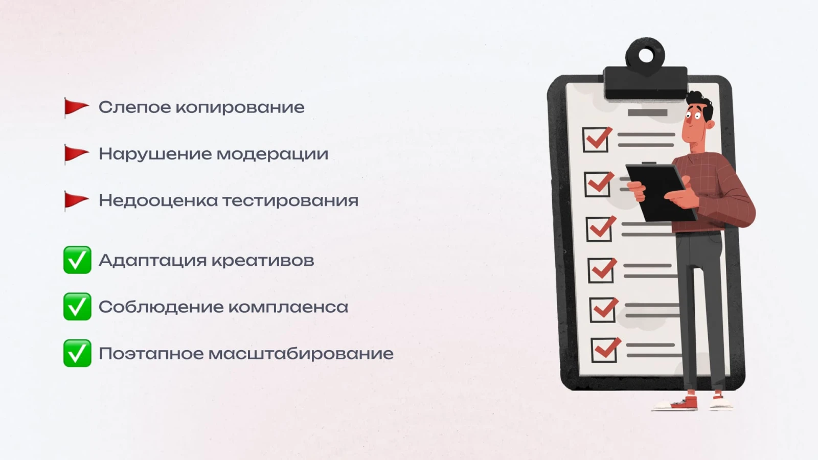 - Соответствие креативов политике поисковых систем и соцсетей