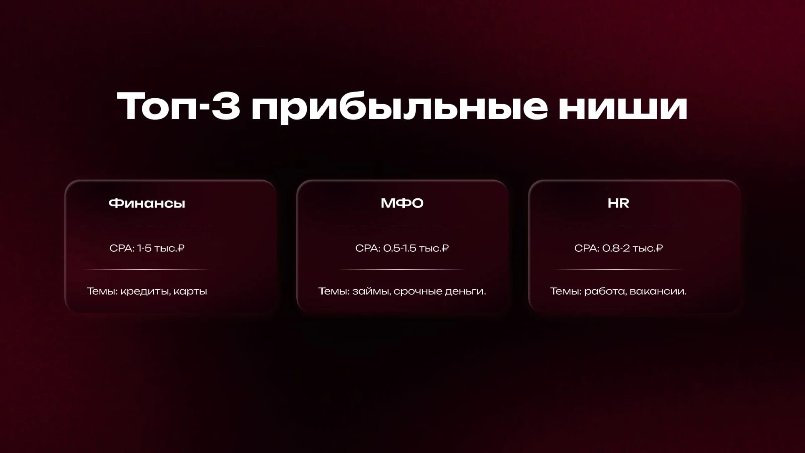 - Тематика: финансы, МФО, HR;