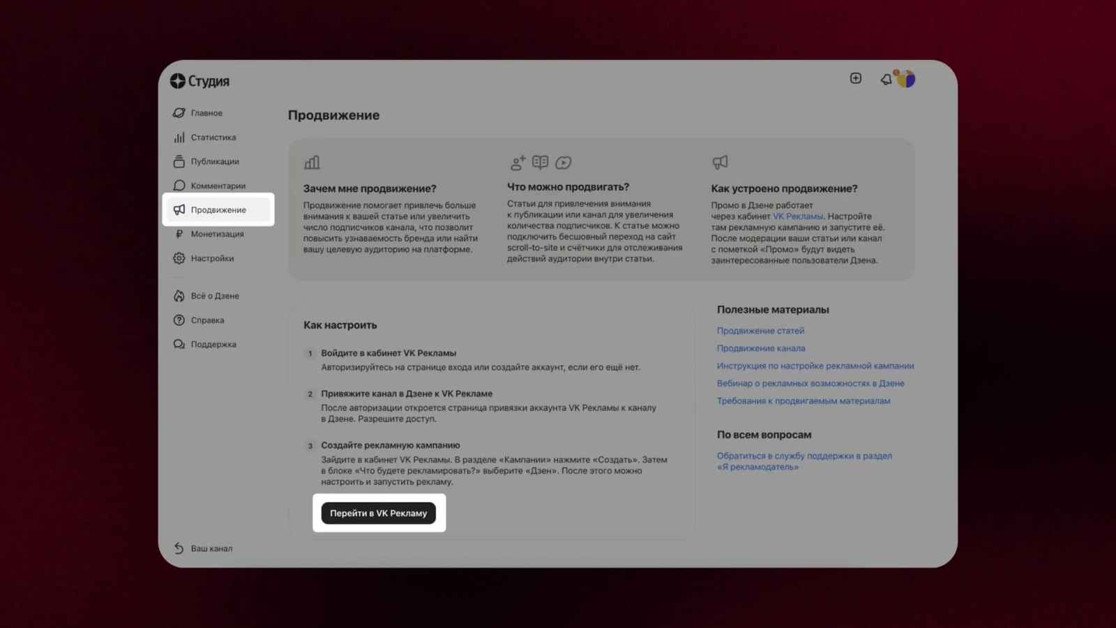 Перейдите в раздел «Промо» в интерфейсе Дзена и привяжите свой кабинет VK. Это можно сделать за пару минут с поддержкой двухфакторной аутентификации.