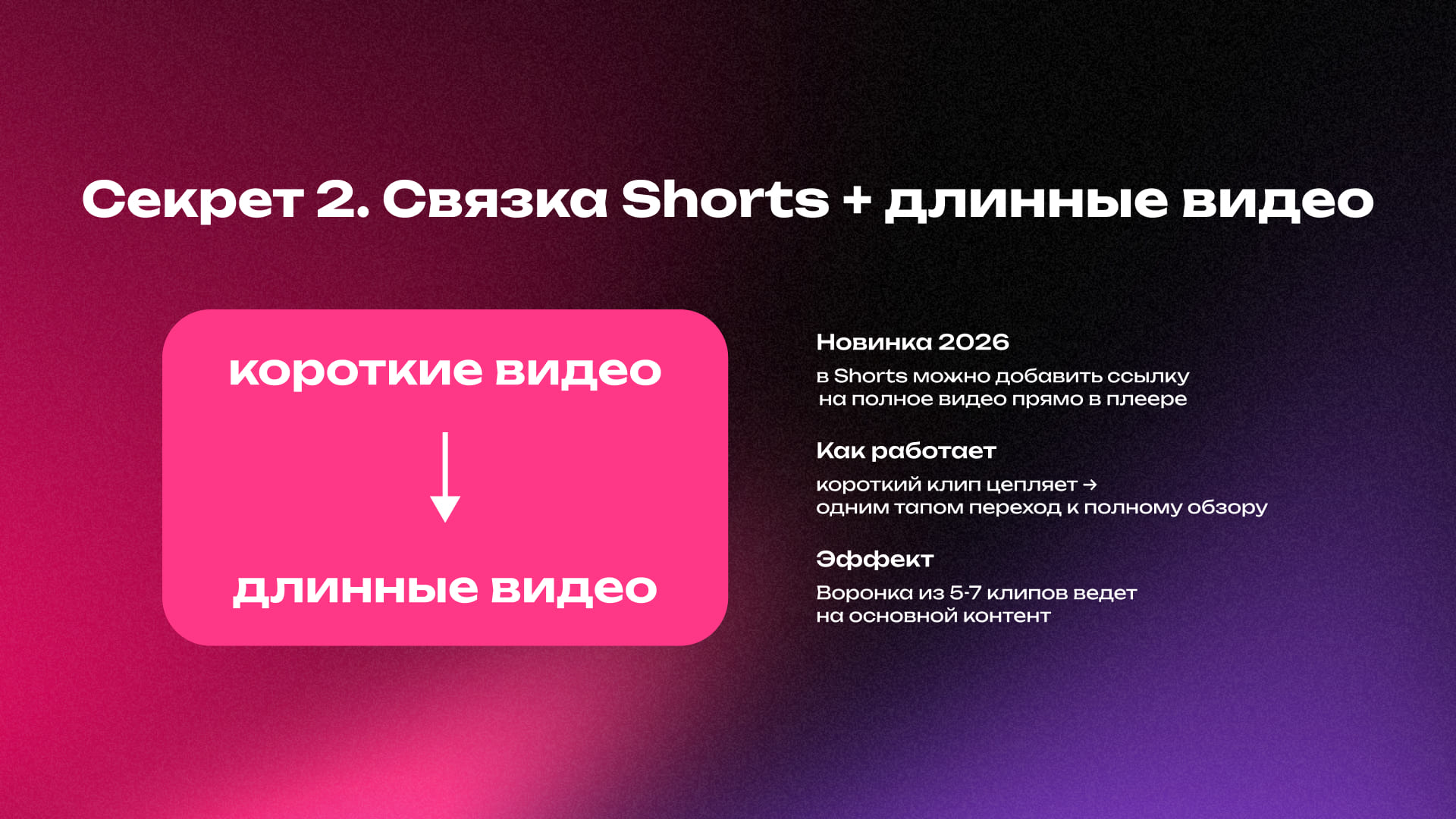 Это меняет правила игры. Раньше Shorts работали как анонс, но не вели к основному контенту. Теперь они стали частью воронки: короткий ролик цепляет внимание в ленте, а встроенная ссылка позволяет сразу перевести аудиторию к полной истории без дополнительных действий.