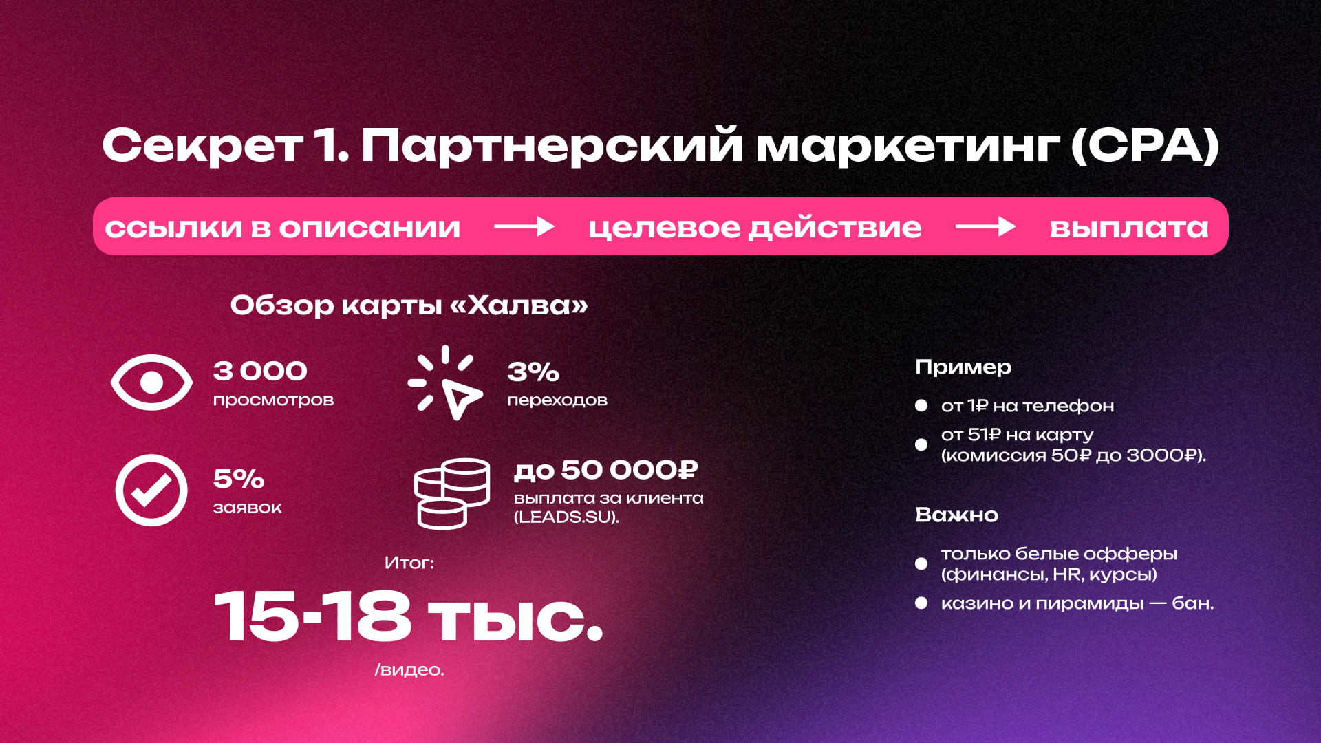 Как это работает: вы снимаете обзор на карту «Халва», рассказываете про кэшбэк и рассрочку, а в описании даете ссылку на оформление. При 5000 просмотров и конверсии 3% в переходы (150 человек) и 5% в заявки (7-8 заявок) ваш доход может составить 15 000-18 000 рублей с одного видео. А видео будет работать годами.