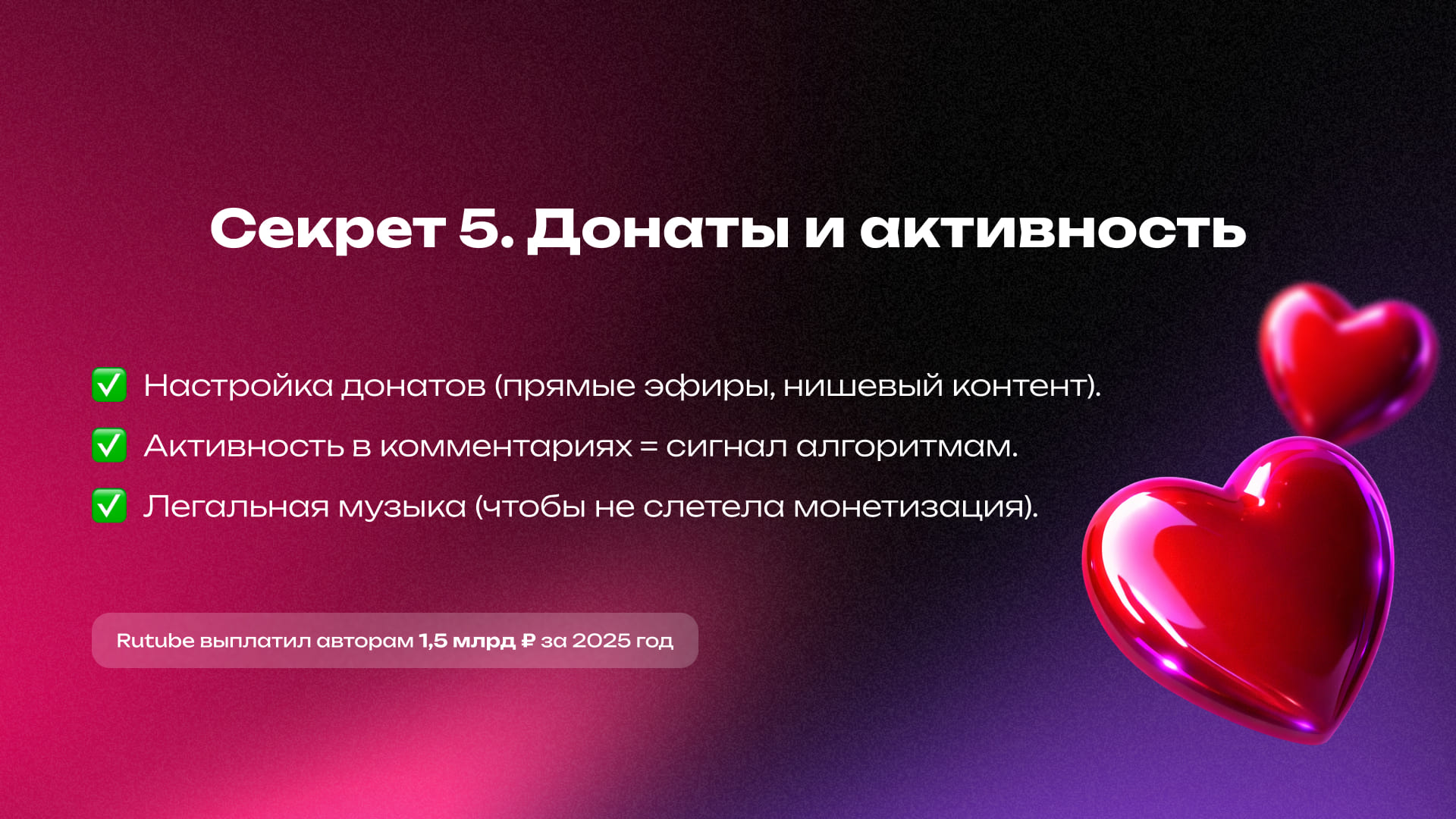 Используйте легальную музыку, правильно указывайте авторство и выбирайте треки из проверенных ресурсов. За 2025 год Rutube выплатил авторам почти 1,5 миллиарда рублей . Помимо прямой монетизации можно зарабатывать на донатах и продаже своих услуг.