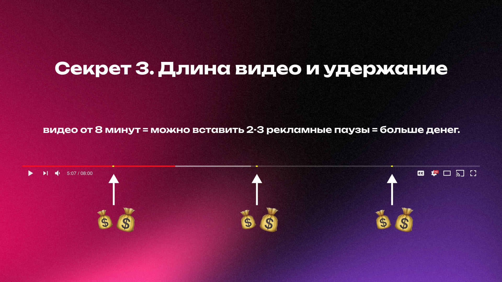 - Работа с удержанием и длиной видео (от 8 минут, 50-60% досмотров)