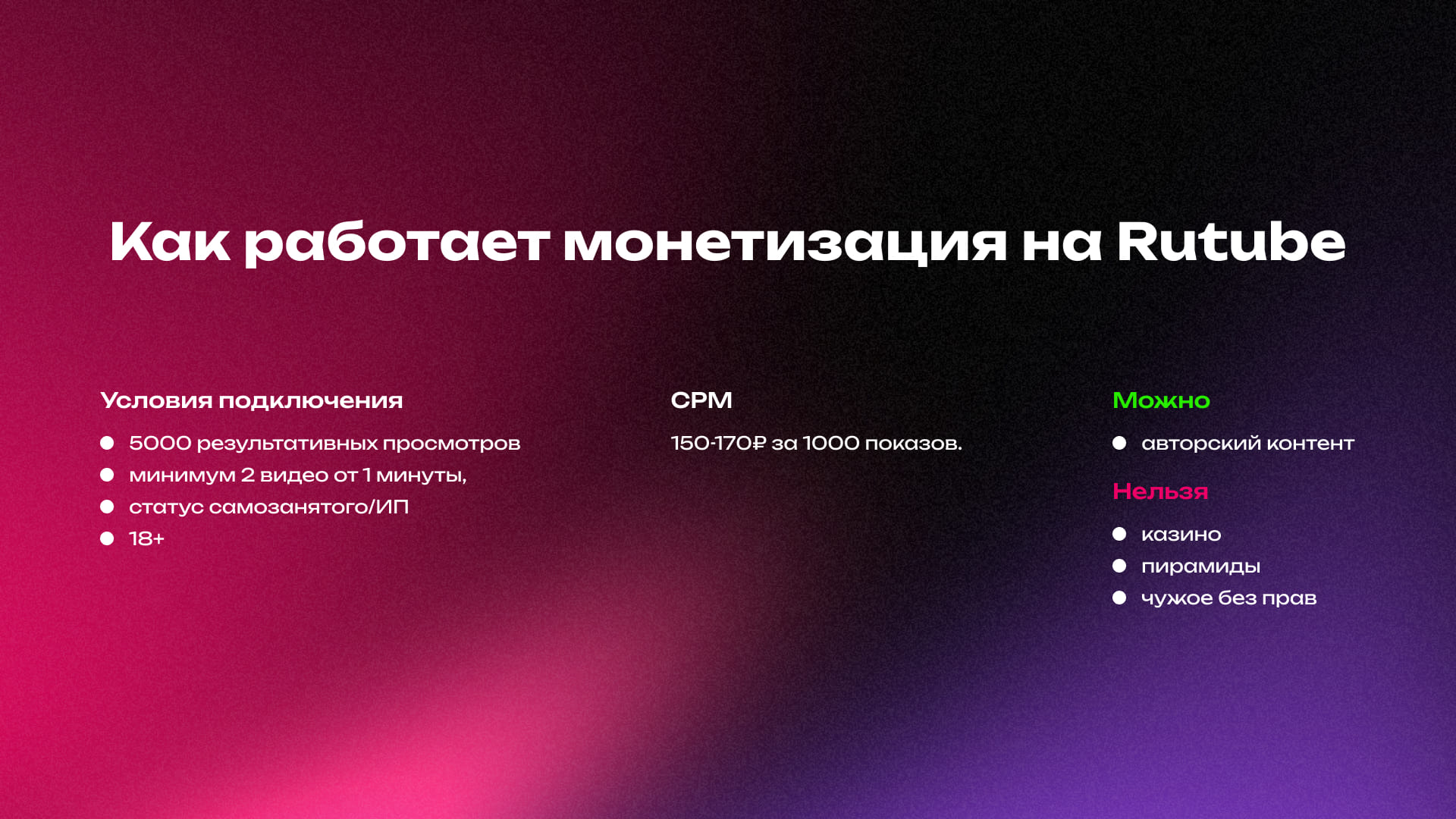 Вывод: Rutube превращается из «просто видеохостинга» в полноценную экосистему для авторов. Качественный канал с 10-20 тысячами просмотров в месяц может приносить стабильный доход, особенно если комбинировать разные способы монетизации.