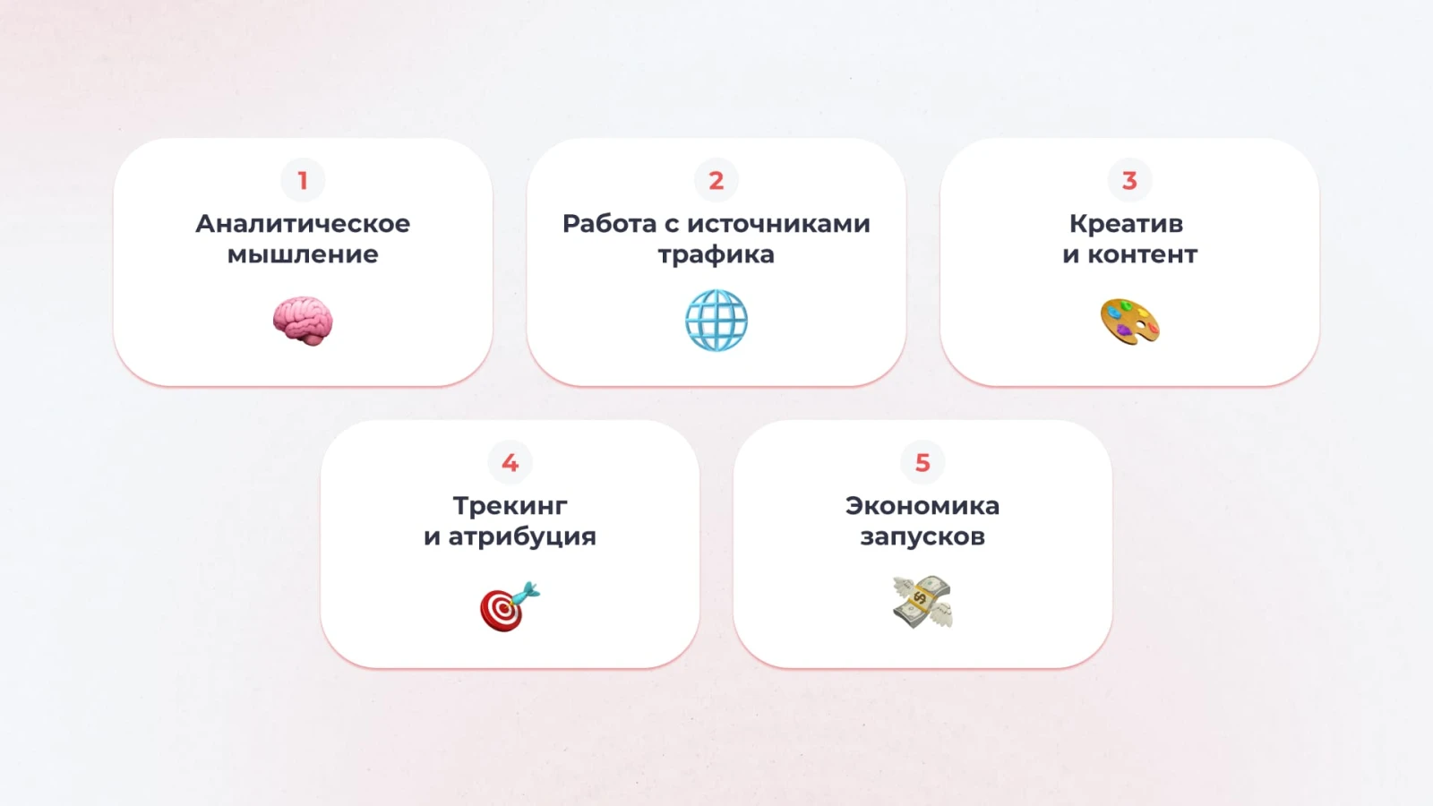 Работа с источниками трафика. Знать сильные и слабые стороны каналов: где преобладает намерение, где важнее охват, где сложнее модерация. Уметь выбирать формат под задачу и вовремя менять плейсменты, чтобы не выжечь аудиторию.