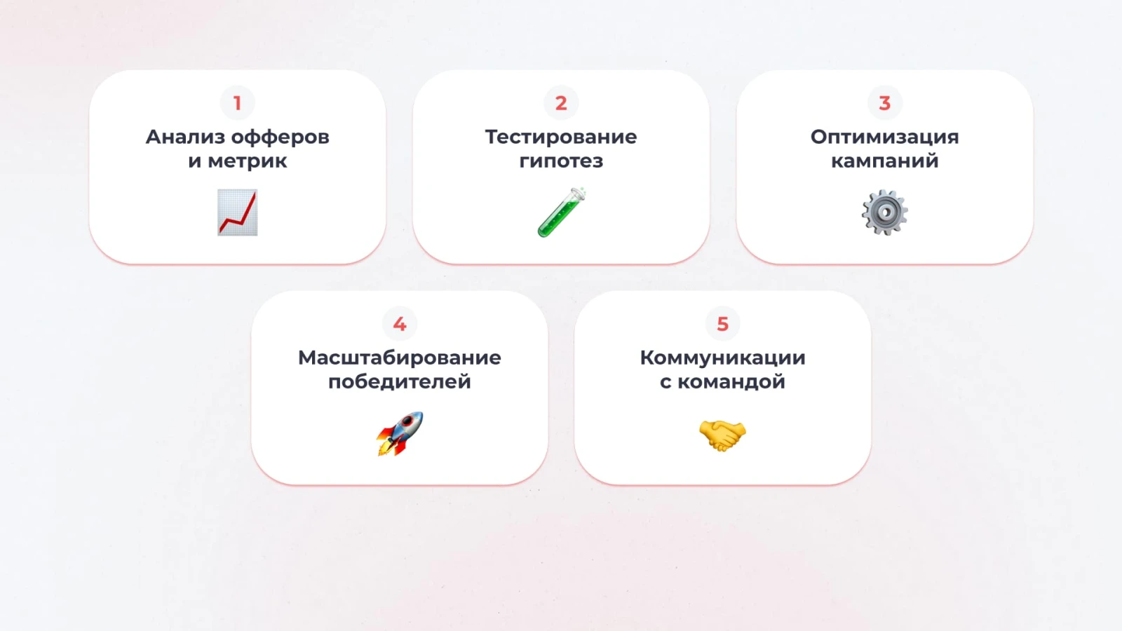 Креатив и контент. Формулировать посыл так, чтобы он совпадал с ожиданиями аудитории и логикой оффера. Ставить чёткие задачи дизайнеру и копирайтеру, держать единый тон между креативом, прелендом и посадочной. Видеть, когда визуал «устал» и пора обновлять.