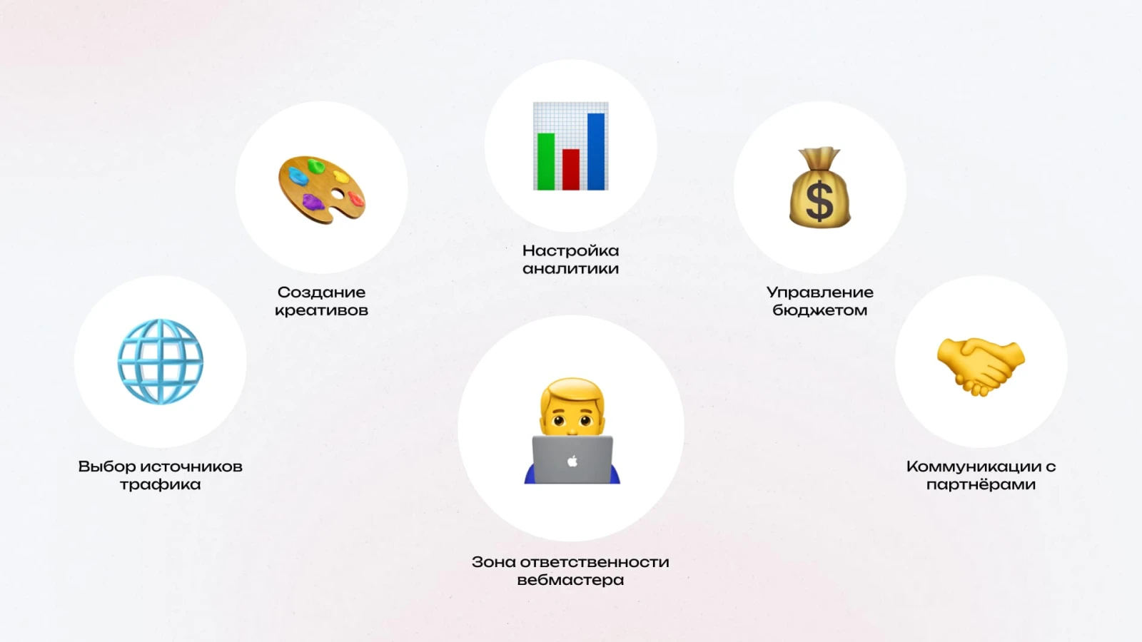 Чтобы не путаться в терминах: ниже мы говорим именно о вебмастере в CPA-экосистеме. Это близко к медиабайеру, но шире. Медиабайер чаще сосредоточен на закупке трафика. Вебмастер держит в руках всю цепочку — от выбора источника до финального статуса лида — и отвечает за связку целиком.