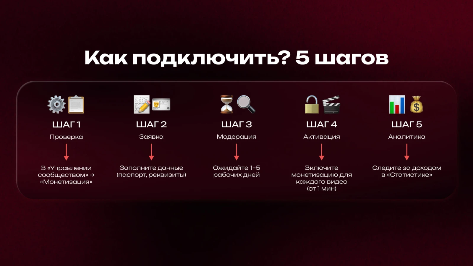 - Шаг 4: Активация. После одобрения включайте переключатель «Включить монетизацию» в настройках каждого видео (от 1 минуты).