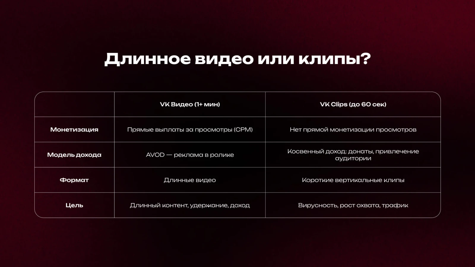 Необходимо проводить четкую границу между длинным видео и коротким форматом. Вертикальные клипы в «VK Clips» (хронометражем до 60 секунд) не участвуют в стандартной программе монетизации через встраиваемую рекламу.