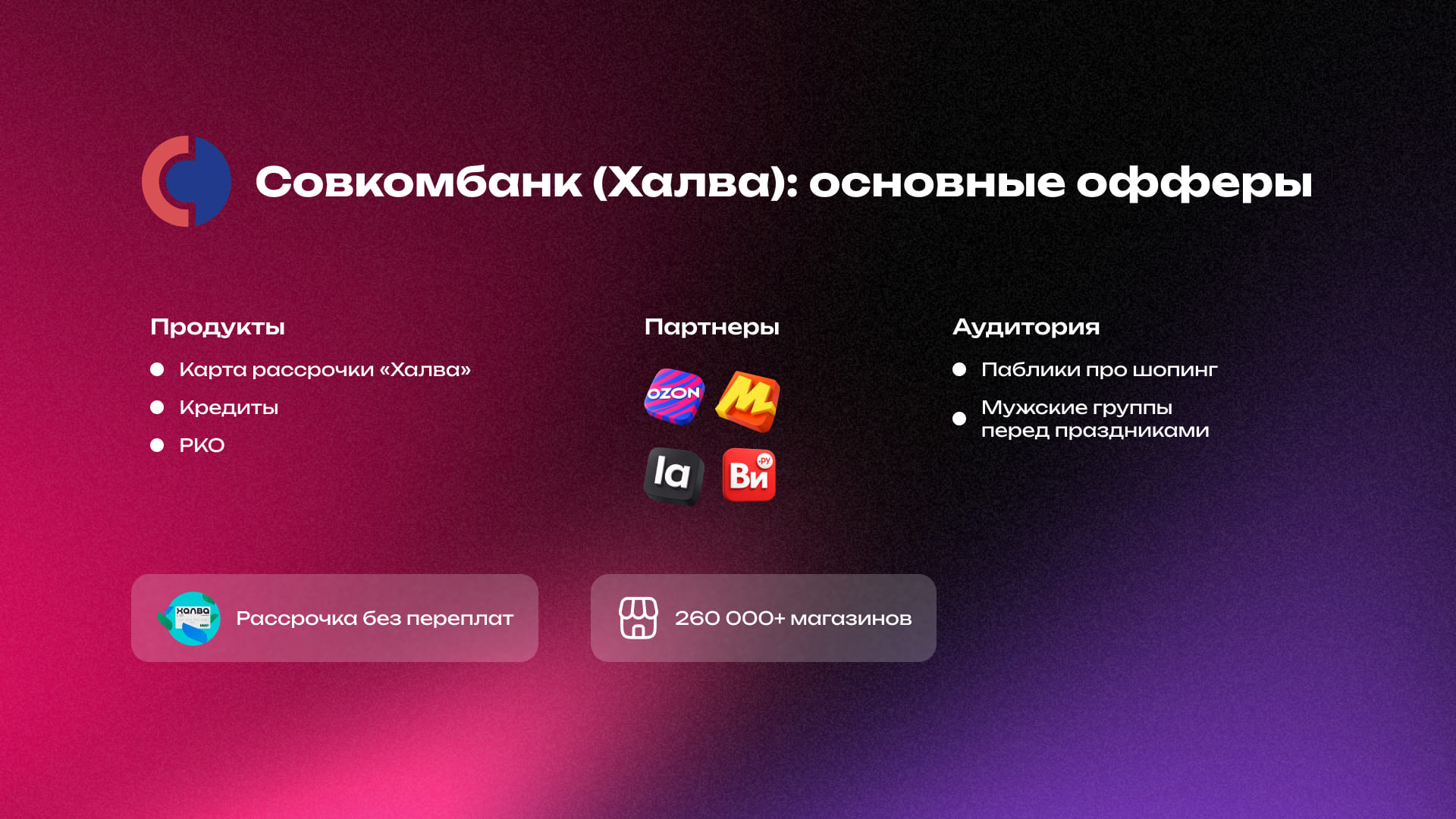 Совкомбанк известен картой «Халва». Сеть партнеров — более 260 000 магазинов: Ozon, Яндекс Маркет, Lamoda, «ВсеИнструменты.ру».
