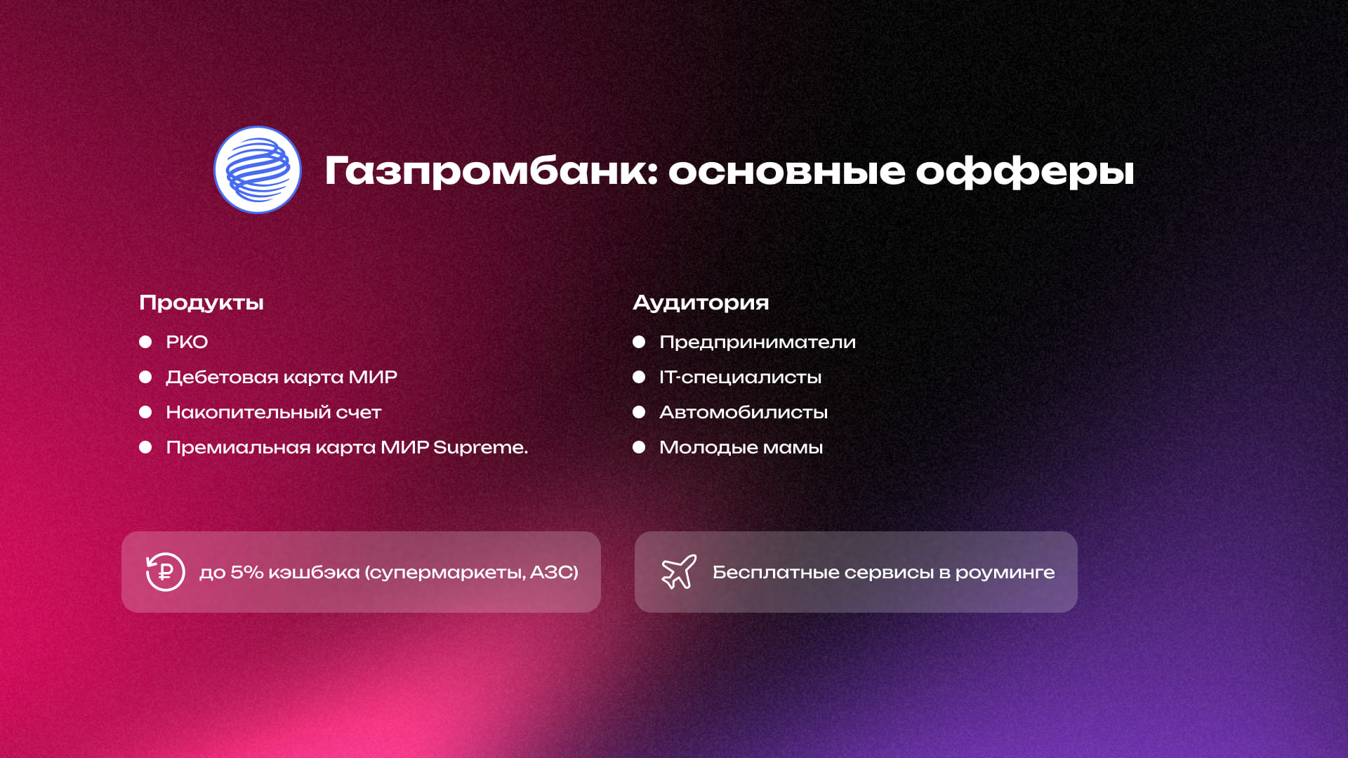 Программа лояльности Газпромбанка дает до 5% кэшбэка в выбранных категориях — это могут быть супермаркеты, заправки, аптеки, кафе, то есть повседневные траты, которые есть у каждого. Для путешественников — бесплатные сервисы от мобильного оператора в роуминге и доступ в бизнес-залы. Количество пользователей программы выросло на 25% за год, и это не только «премиальная» аудитория, а самые обычные люди, которые просто хотят получать выгоду от своих покупок.