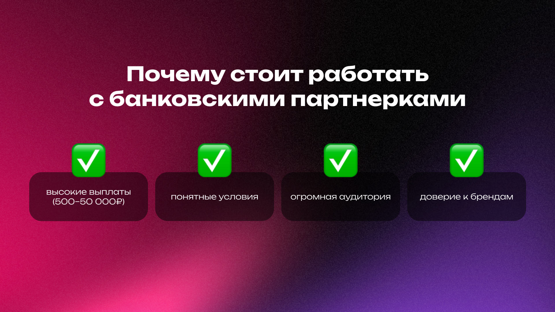 ❗️ Единственное требование — качественный трафик. Банки не любят ботов и фрод, им нужны живые люди. Но если у вас есть лояльная аудитория, вы будете зарабатывать стабильно и много.