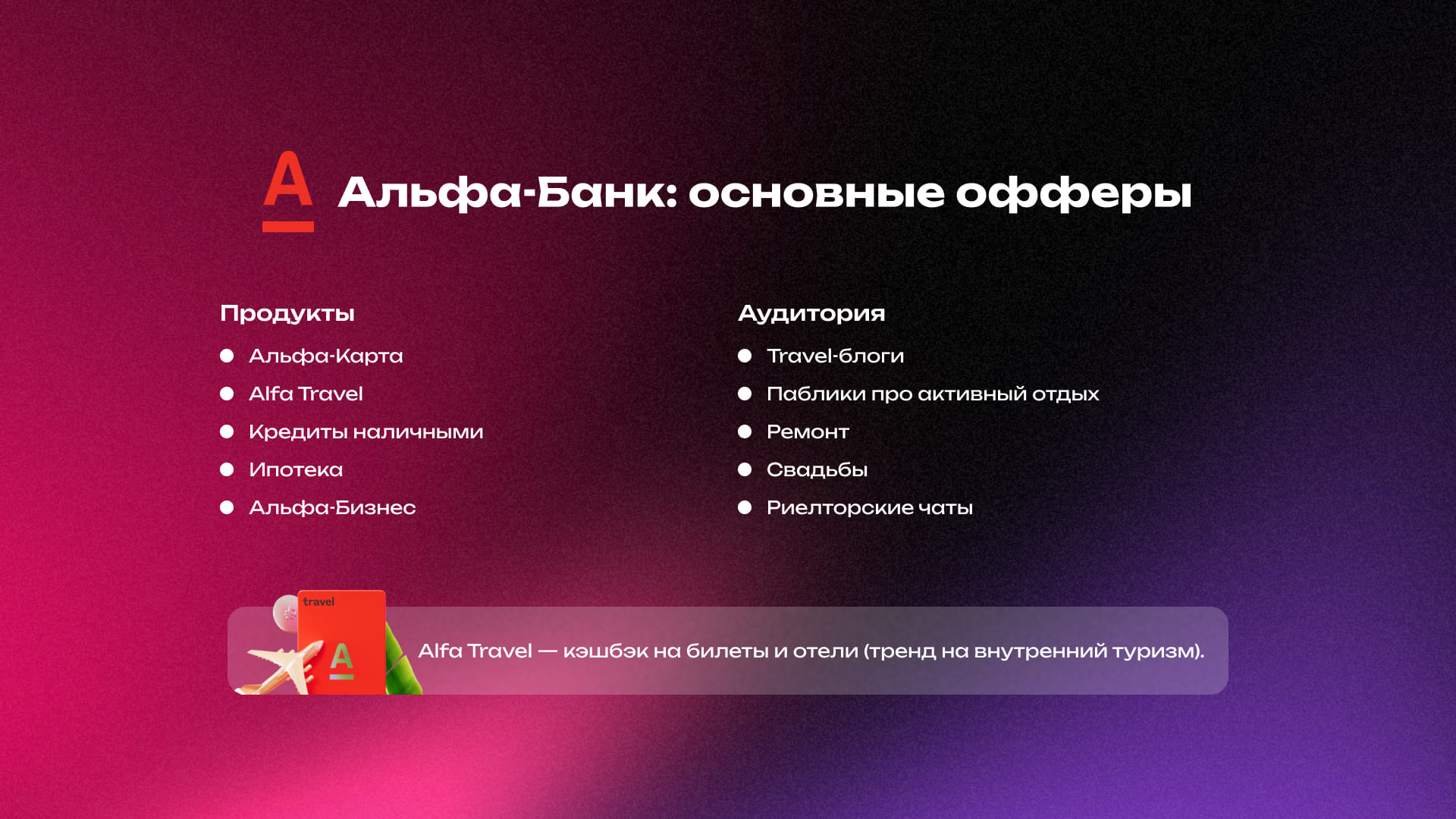 Alfa Travel — для travel-блогов, но также для пабликов про активный образ жизни, про выходные за городом, про отдых с детьми. Кредиты наличными можно продвигать где угодно — от ремонтных пабликов до групп про свадьбы. Ипотека — в риелторских чатах, группах новостроек, семейных сообществах.