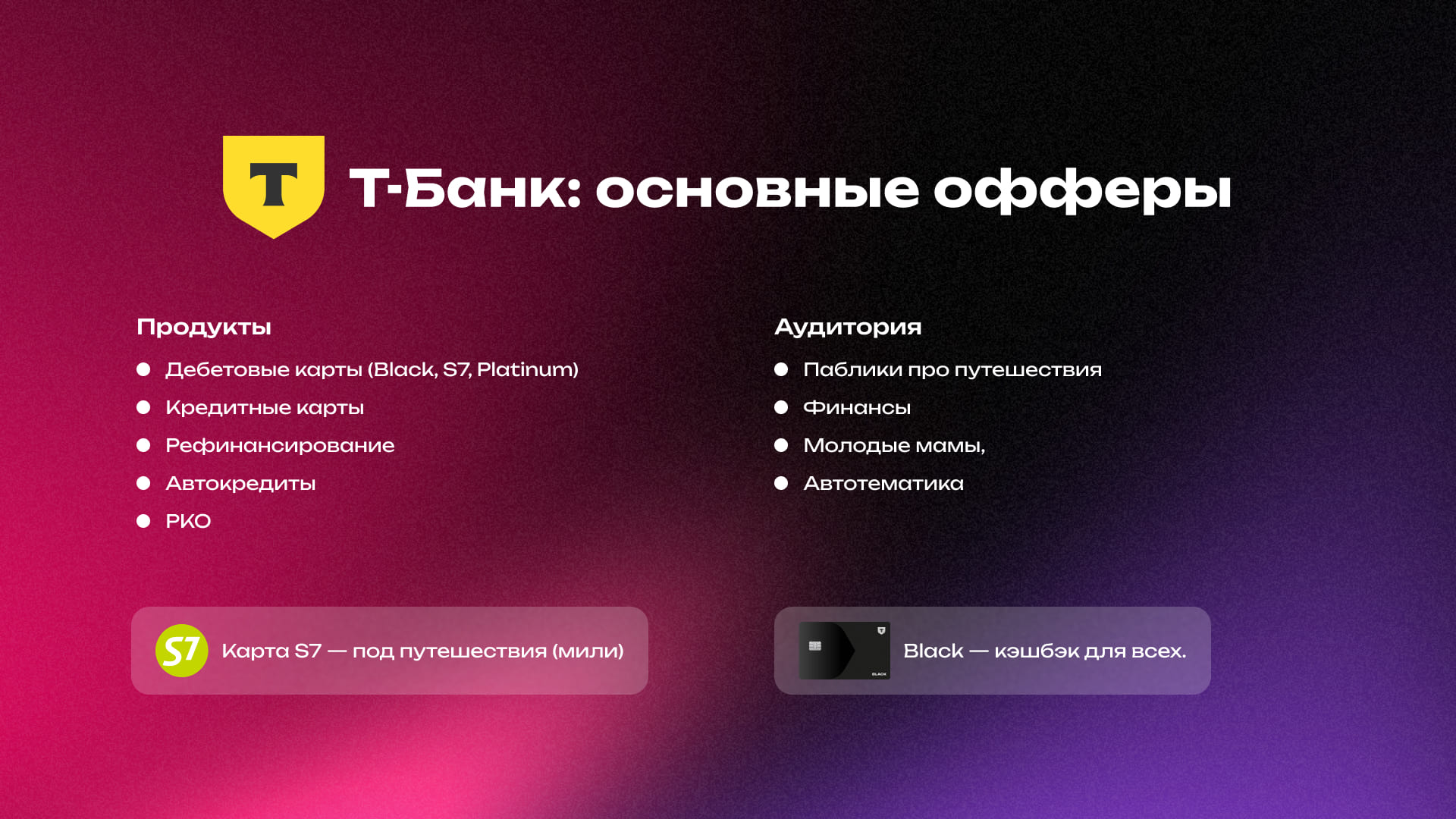 Карту Т-Банк S7 можно рекламировать не только в travel-блогах. Например, в мужских пабликах перед 8 марта: «Думаете, что подарить девушке? Подарите путешествие. А карта S7 поможет накопить мили на билеты». Т-Банк Black с кэшбэком отлично зайдет в пабликах про финансы, но и в группах молодых мам — там постоянно обсуждают, на чем сэкономить и как получать кэшбэк с детских покупок. Автокредиты — не только в автотематике, но и в любых мужских сообществах, где обсуждают ремонт, стройку, крупные покупки.
