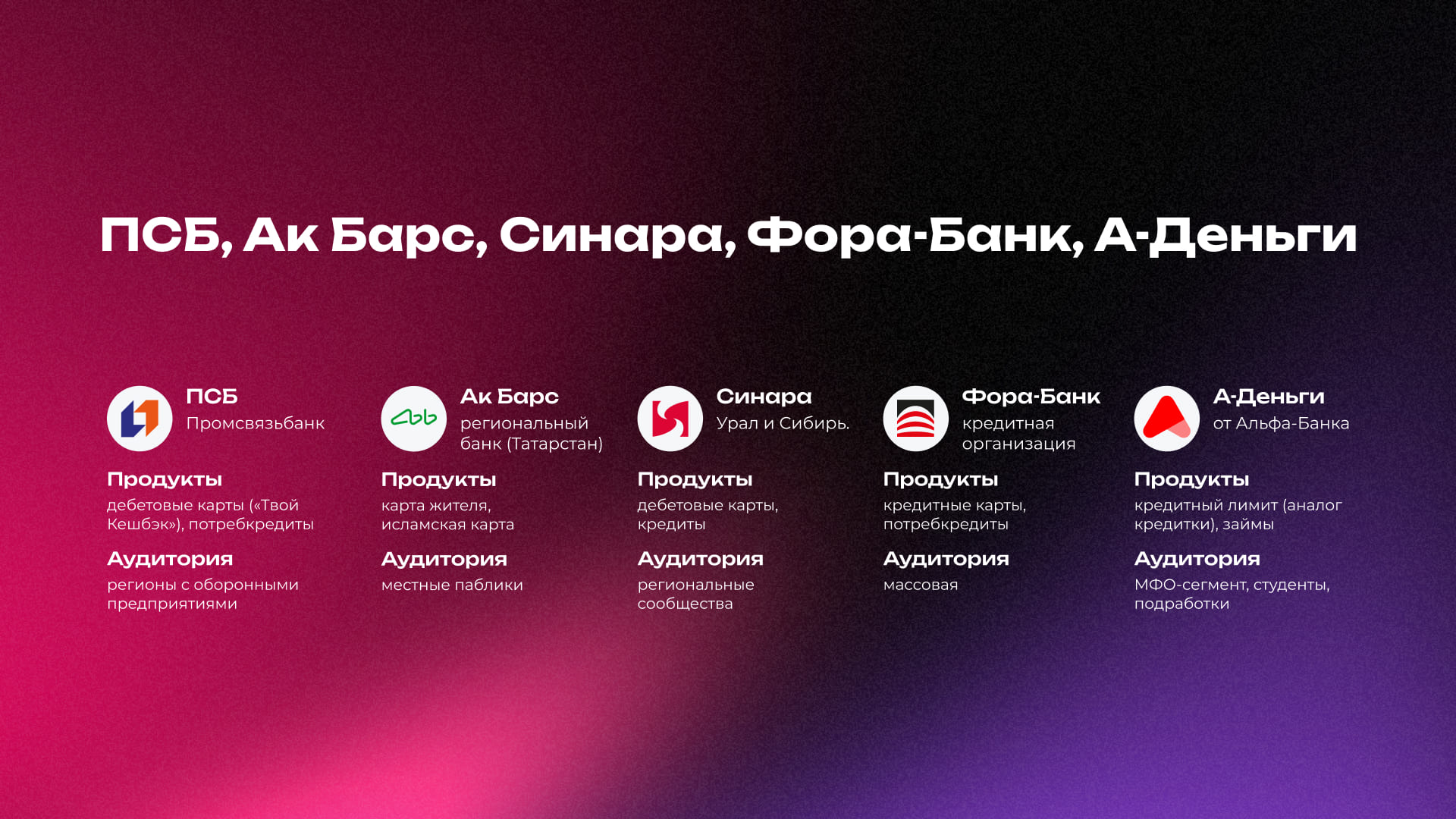Почему это интересно. Те же преимущества — низкая конкуренция и высокое доверие местной аудитории. Банк Синара известен в своих регионах, его знают, ему доверяют. Многие предприятия Урала и Сибири переводят зарплаты сотрудников именно сюда, а значит, у вас есть доступ к аудитории с гарантированным доходом. Это идеальные клиенты для кредитных продуктов и карт с кэшбэком.