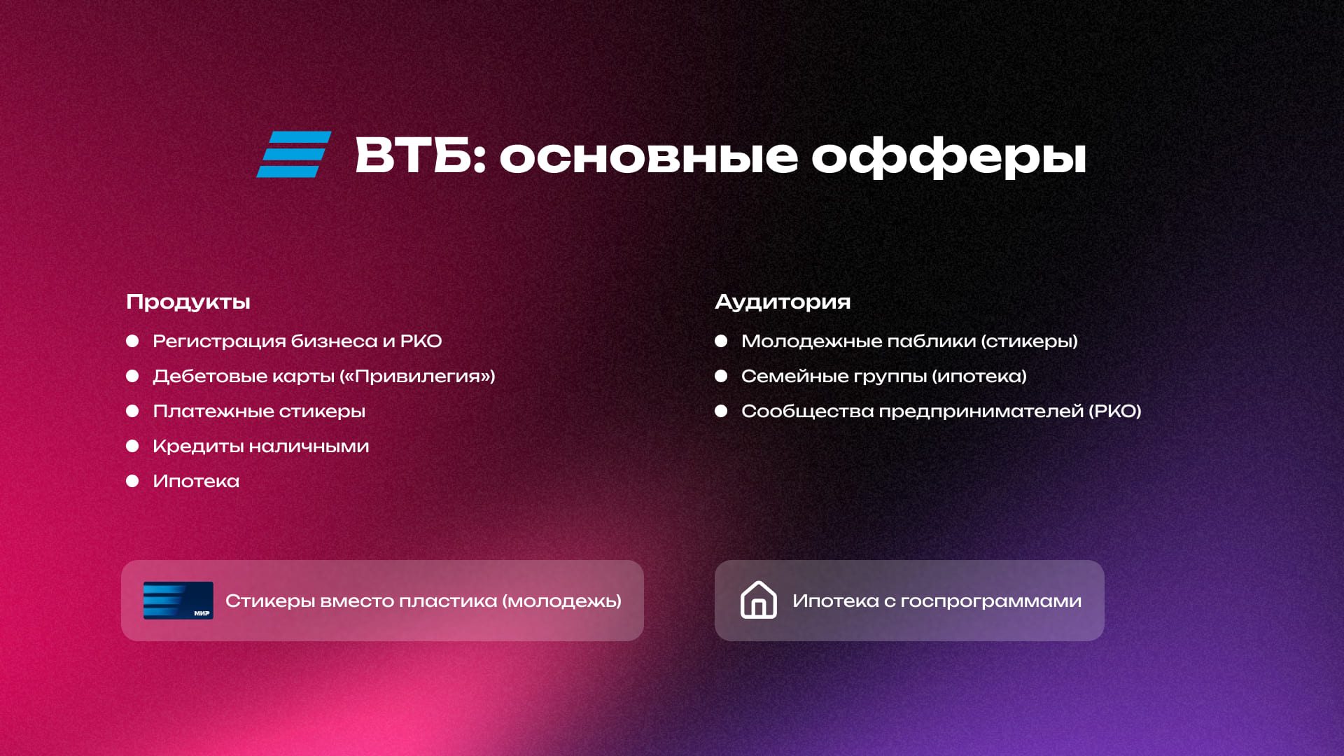 ВТБ делает ставку на комплексное обслуживание. Платежные стикеры набирают обороты — спрос вырос на 40% за год, молодежь отказывается от пластика. Ипотека остается востребованной благодаря госпрограммам и семейной ипотеке.