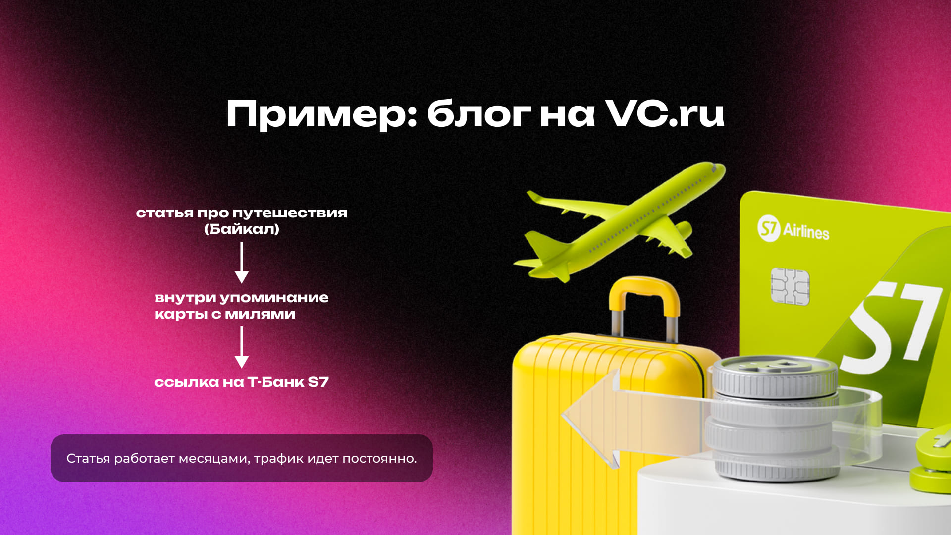 Пример. Допустим, вы ведете блог про путешествия на VC. Пишете статью «Как мы съездили на Байкал и потратили всего 50 000 рублей». Внутри рассказываете, что часть денег сэкономили благодаря карте с милями — и даете ссылку на Т-Банк S7. Статья остается в блоге, ее читают месяцами, и все это время по ссылке приходят новые люди.