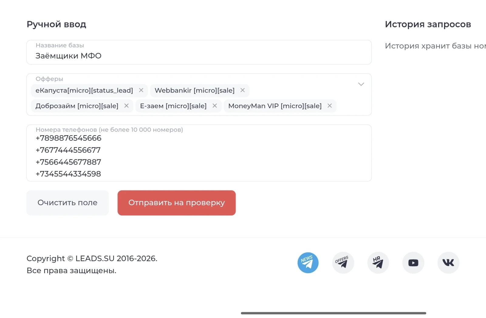 Ручной ввод делается так: Первое — задаёшь название базы. Второе — выбираешь нужные офферы из списка. Третье — вставляешь номер в поле и нажимаешь «Отправить на проверку». Проверка уйдёт в работу, а готовый результат появится в истории запросов. Оттуда его можно открыть и скачать.
