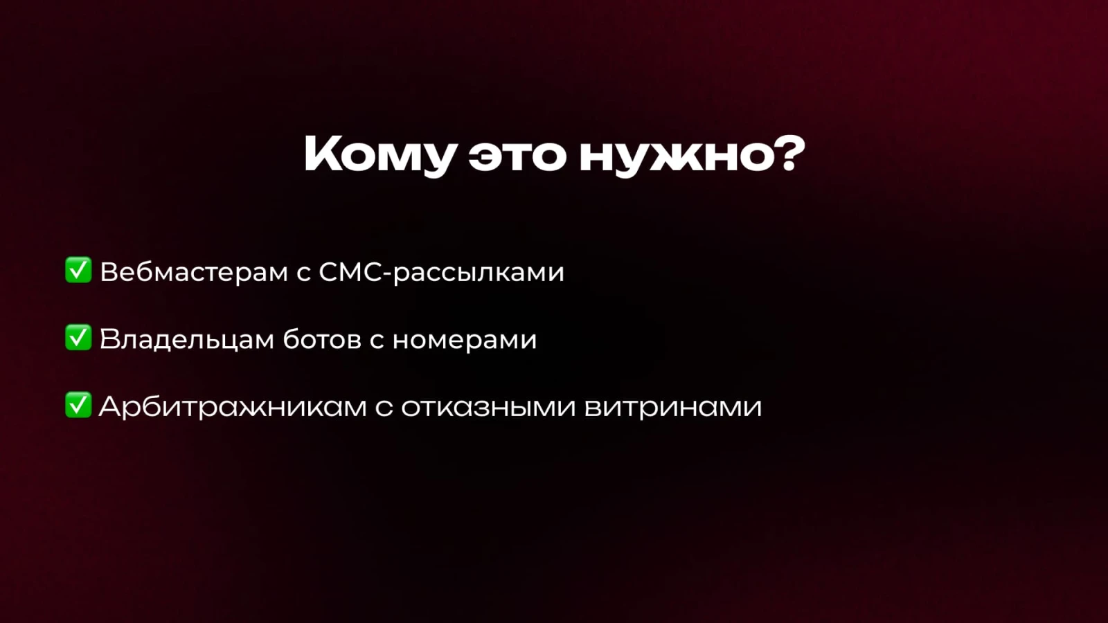 - Те, кто собирает номера в боте. Бот насобирал контактов, вы интегрируете Чекер в воронку и перед отправкой на оффер проверяете — новый человек или уже был.