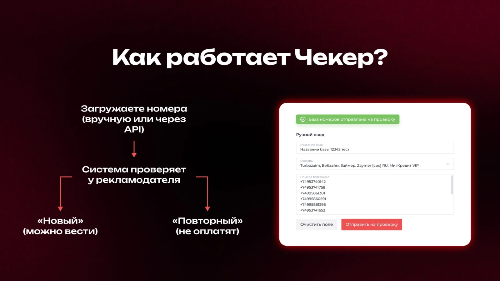 Чекер — это сервис для проверки номеров телефонов по базам рекламодателей МФО. Вы просто загружаете список номеров, система шифрует их, пробивает у рекламодателя и через секунду дает ответ: «новый» или «повторный».