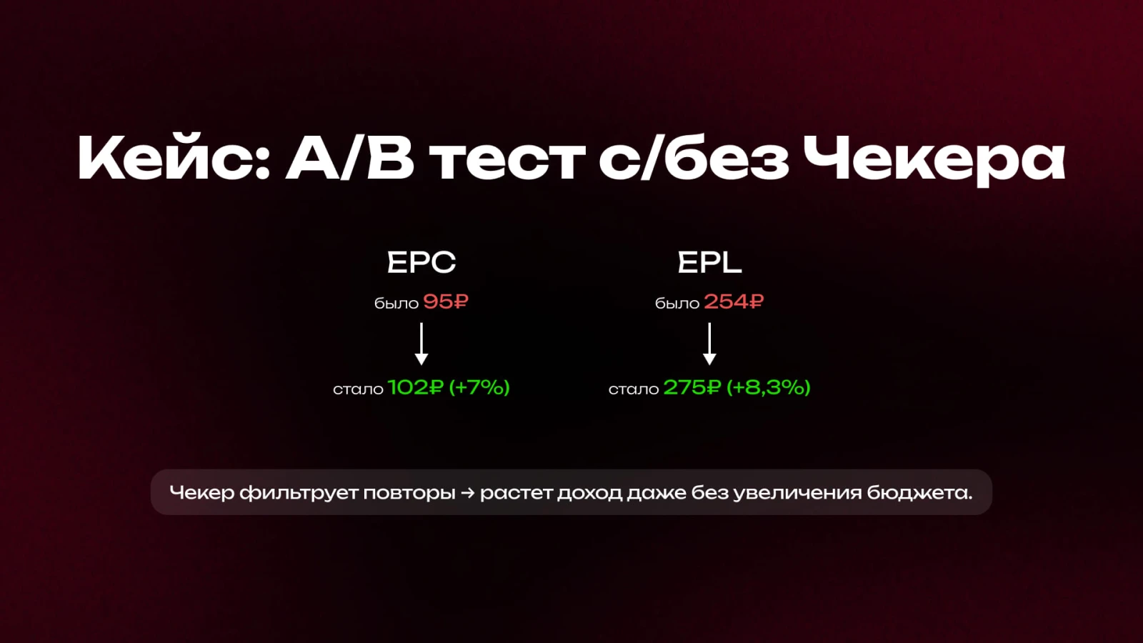 Вот простой пример на A/B-тесте. EPC без чекера — 103 ₽, EPC с чекером — 132 ₽. Разница появляется именно из-за фильтрации повторов и более чистого входа. Почти 30% роста просто за счёт того, что ты перестал сливать на тех, кто уже был в базе.