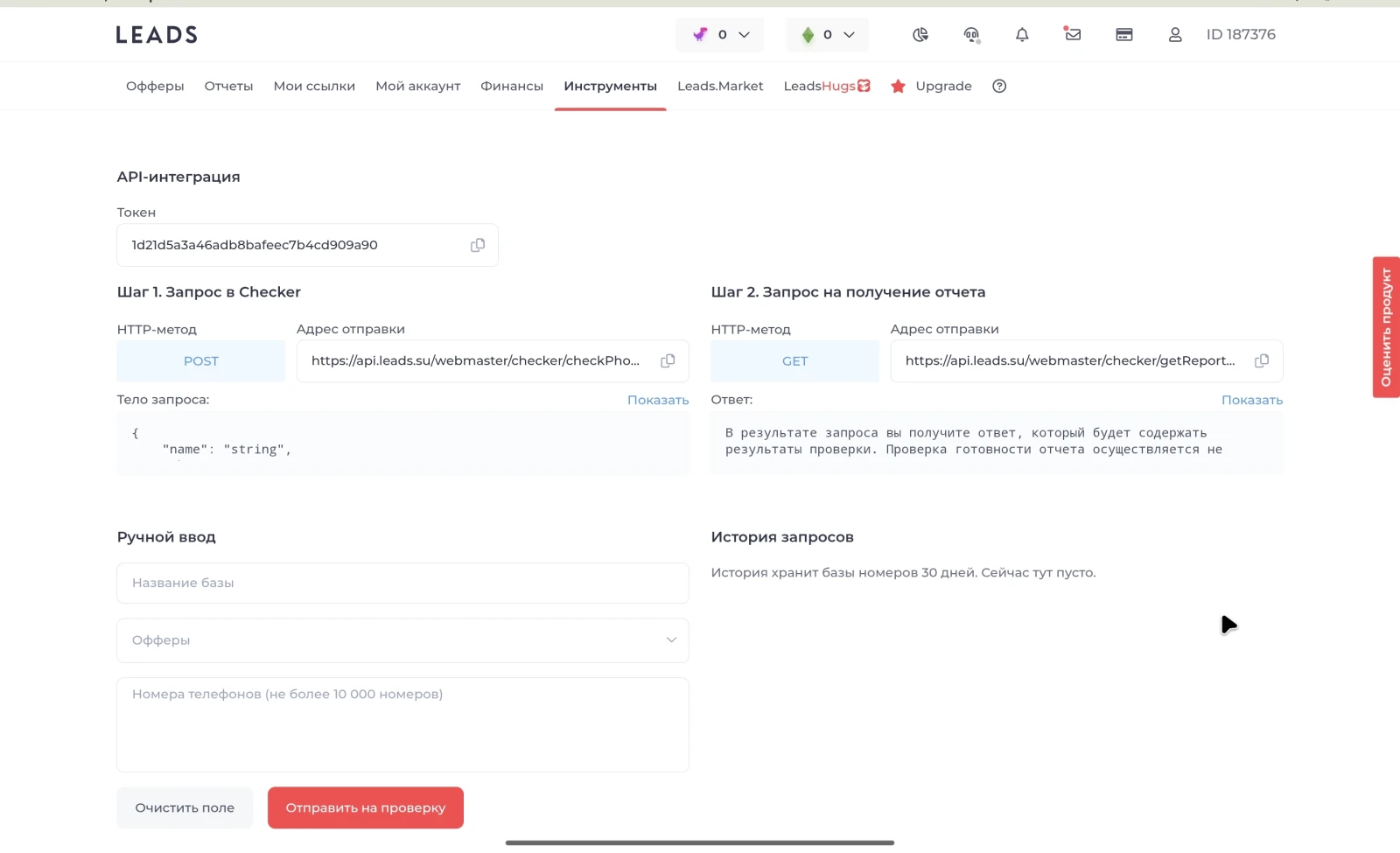 - API-интеграция. Это когда твои номера уходят в проверку автоматически из твоей системы или бота.