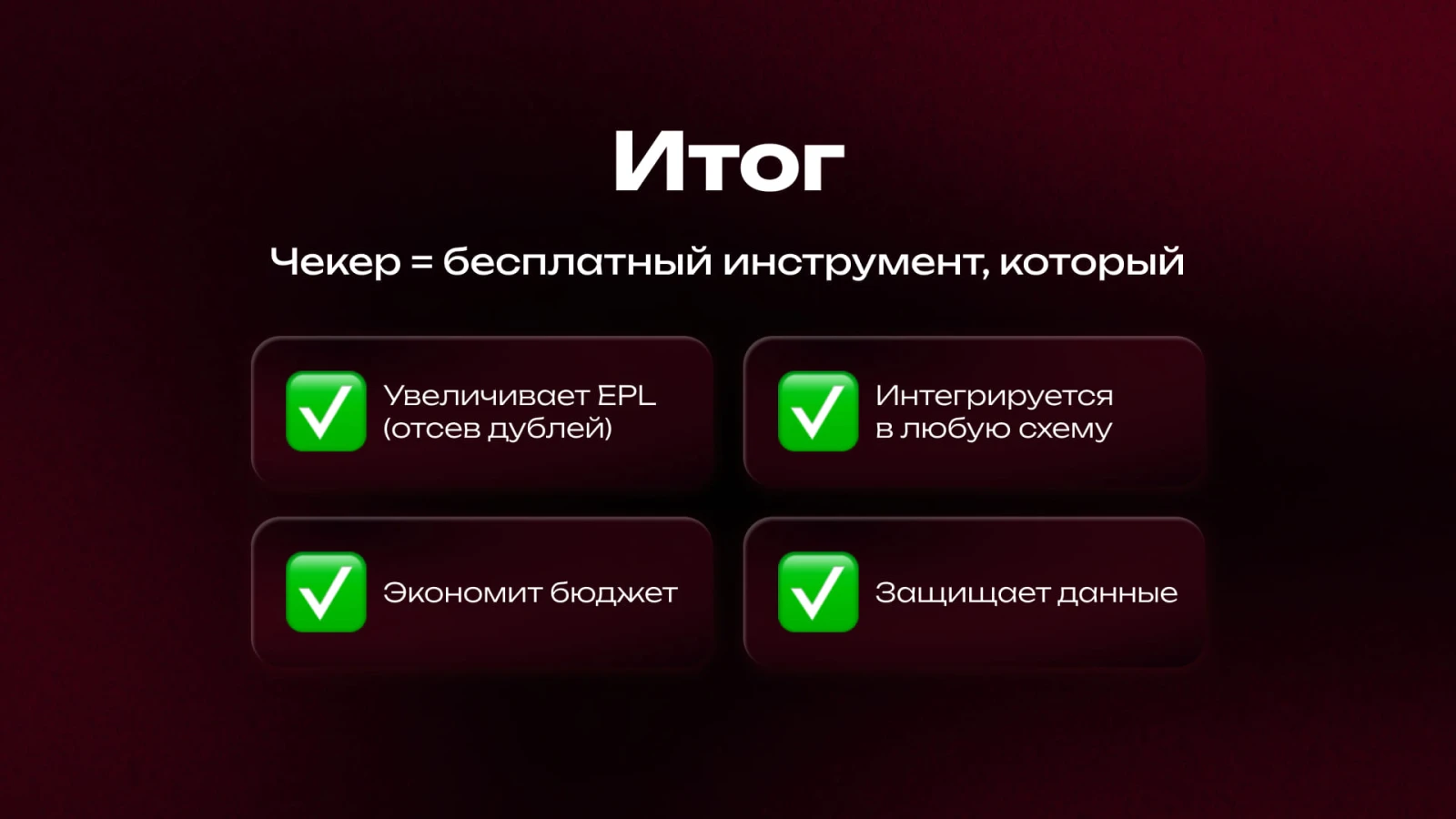 Что в итоге:Чекер нужен для простого действия: убрать повторников до того, как они попадут в воронку. Потому что если человек уже есть у рекламодателя, за него не платят. А трафик и рассылка на него стоят денег.